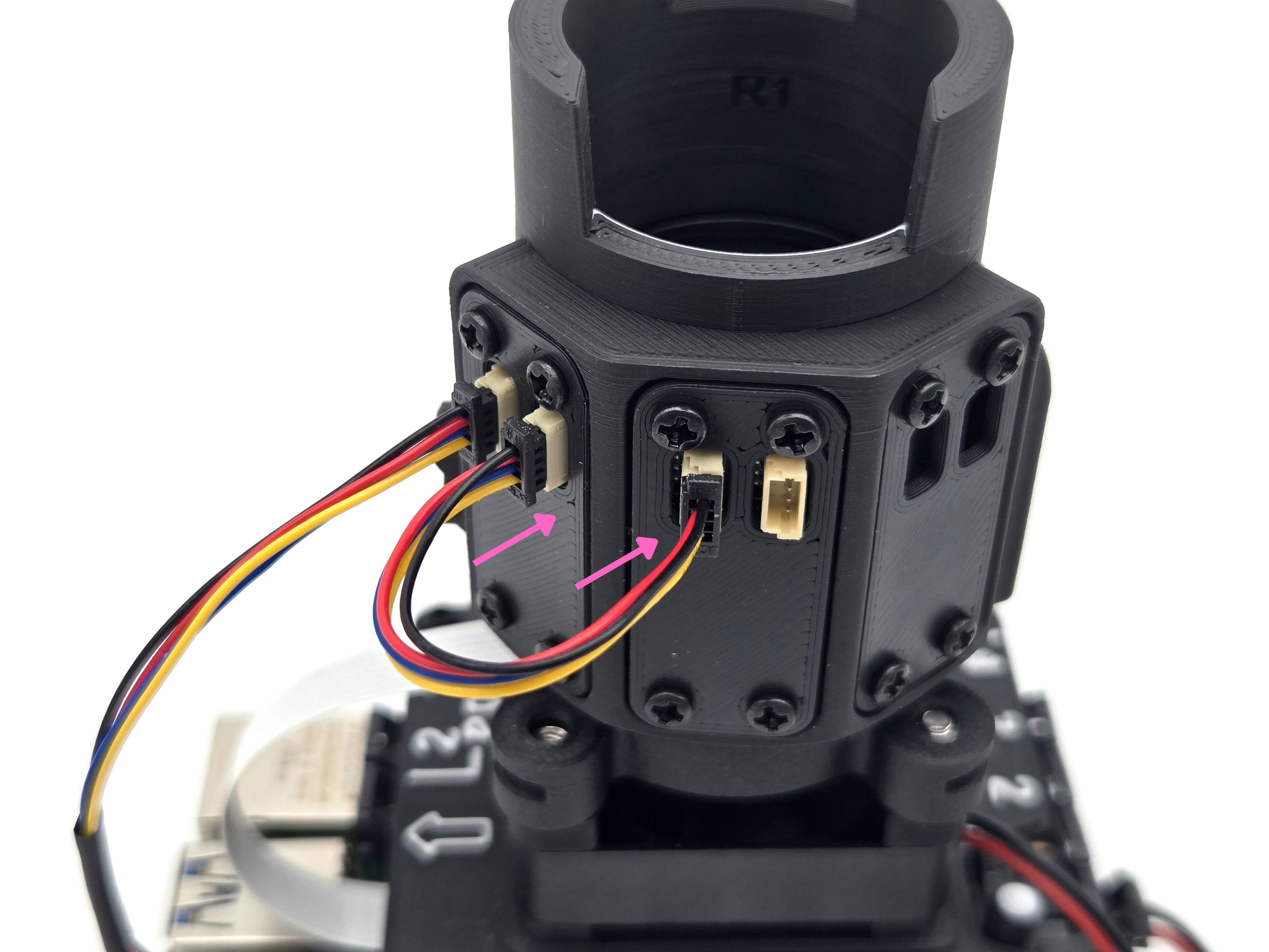 - Connect the other end to the leftmost eye-spy. Use the colors of the wire to orient the connector correctly.