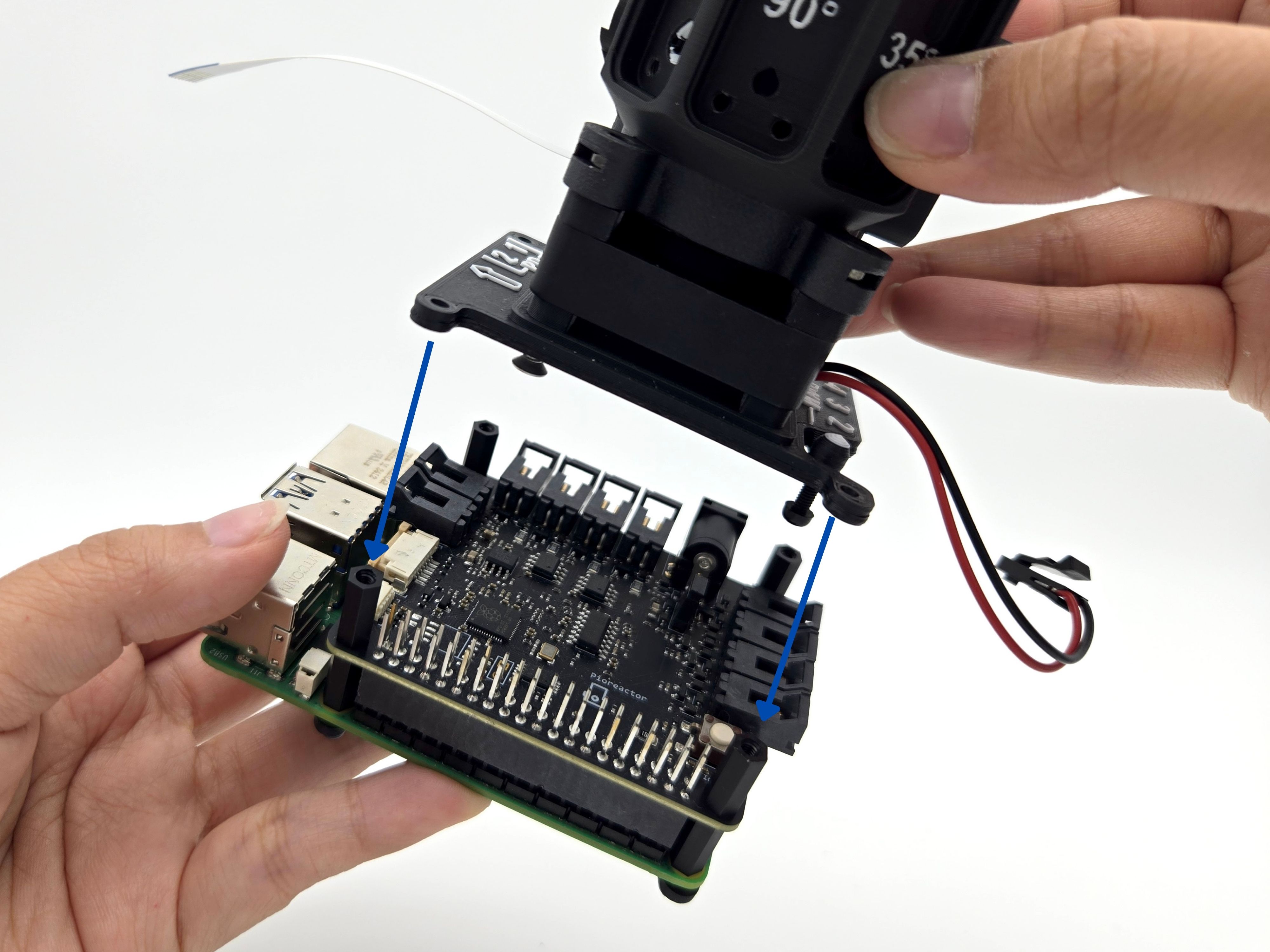 - Place the vial holder assembly onto the Raspberry Pi/HAT's corners. The GPIO pins align with the side notch of the faceplate.