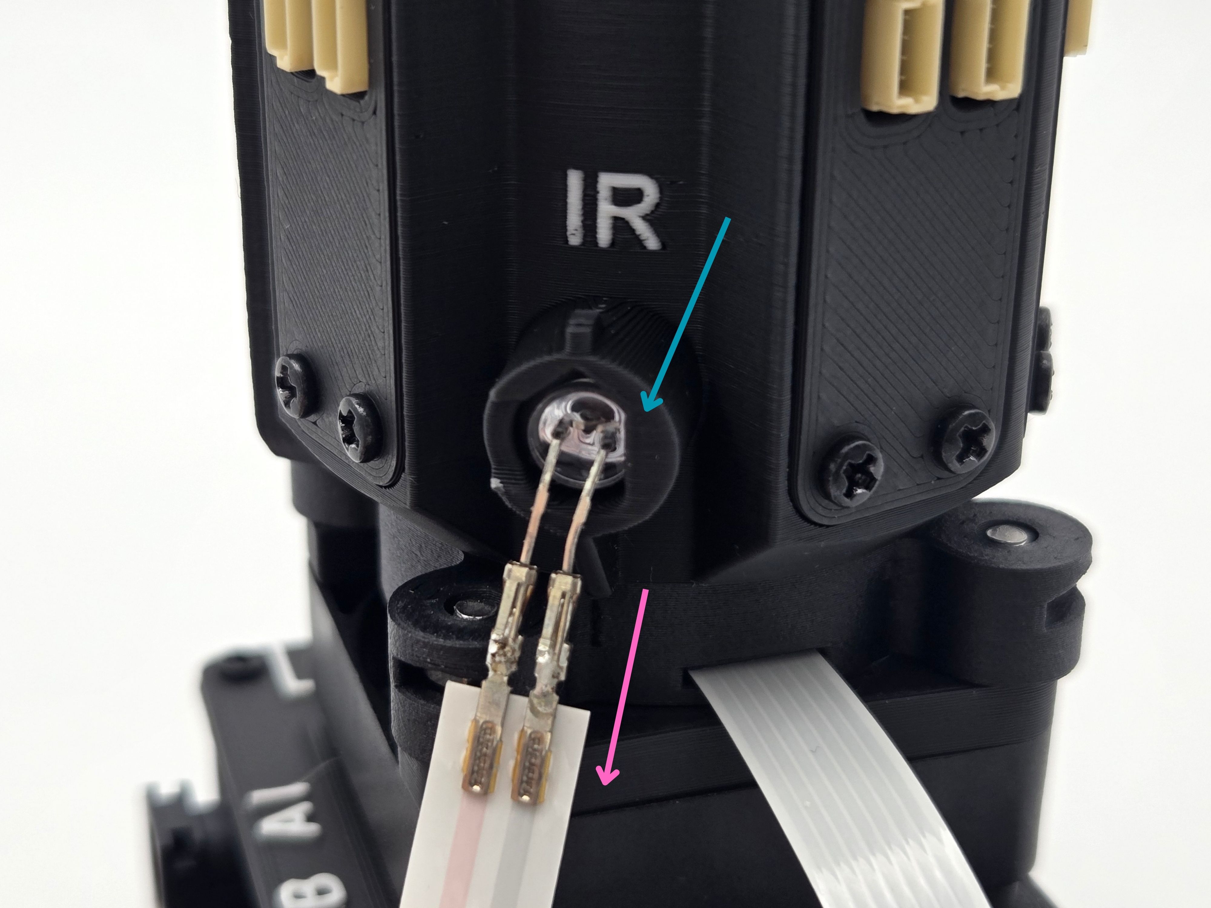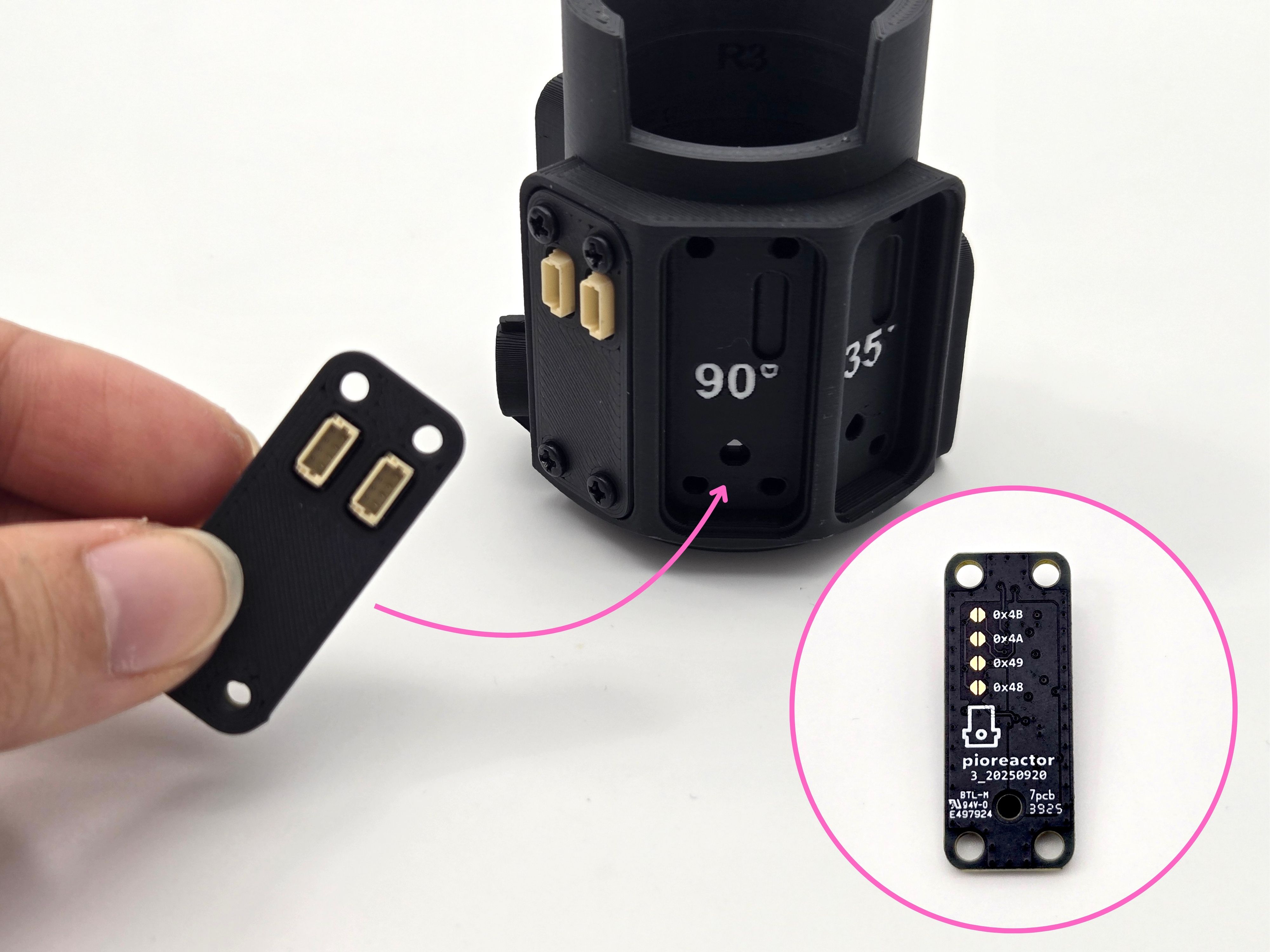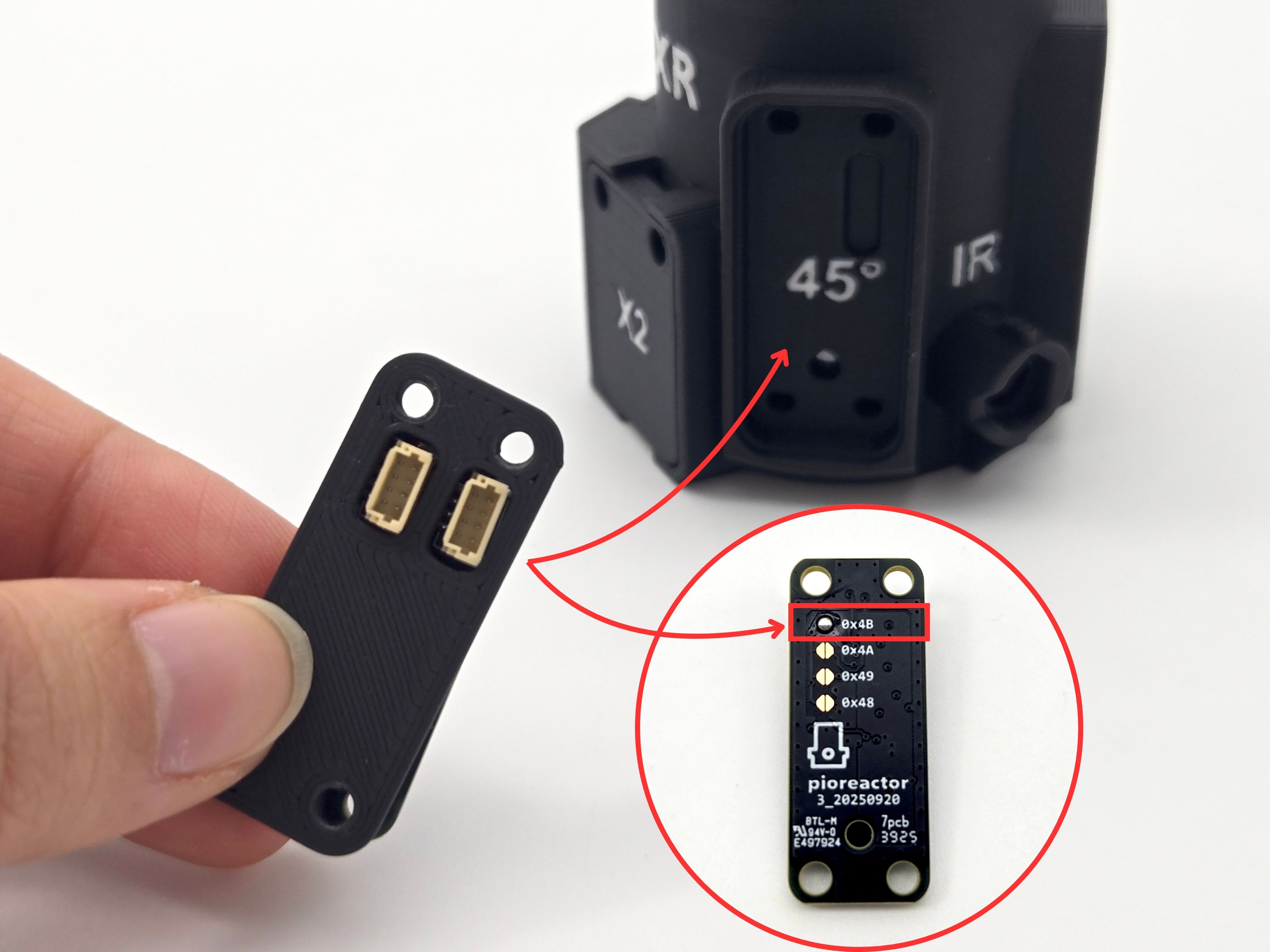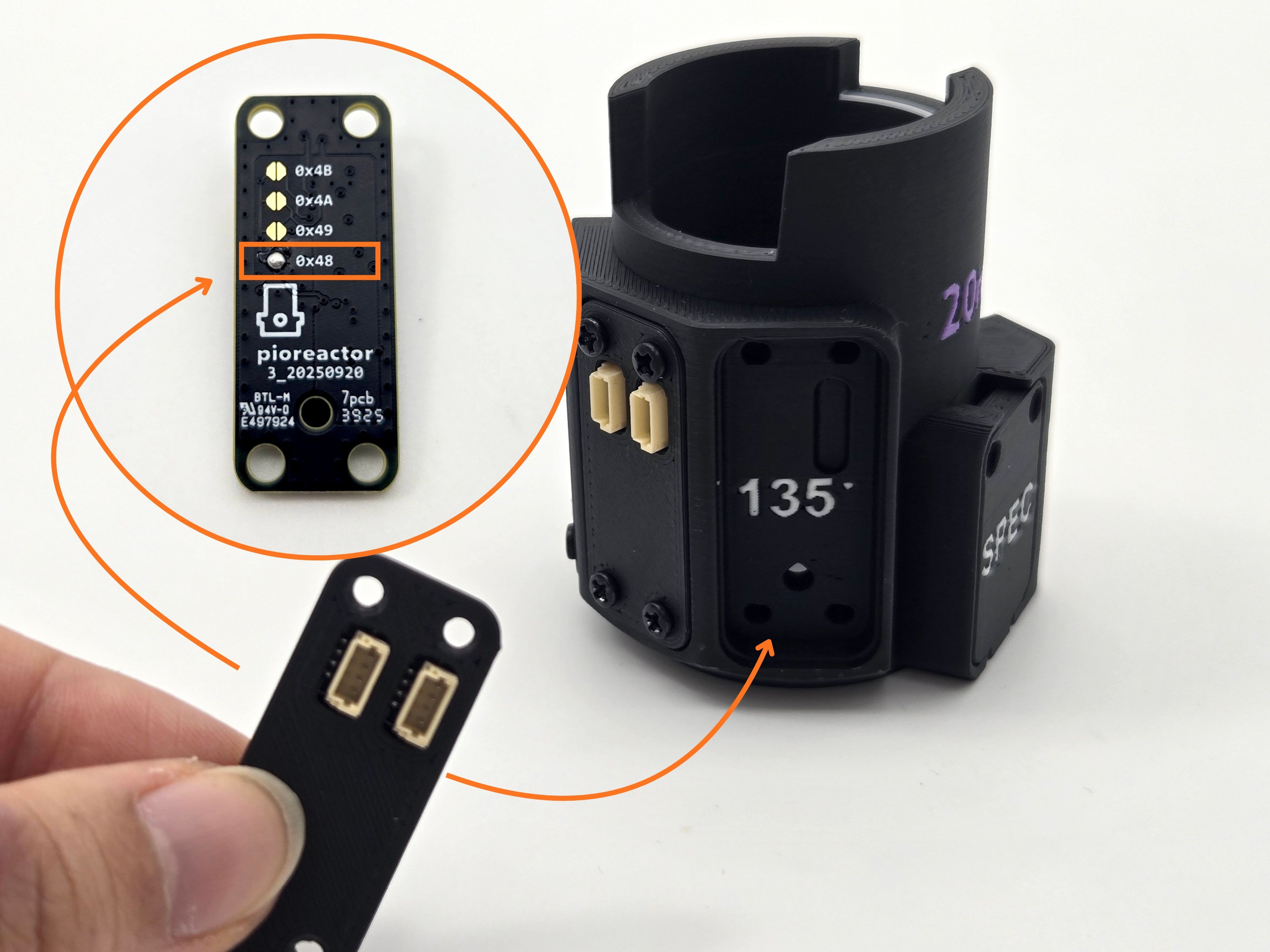 - Last, the eye-spy with the address 0x48 goes into the 135 degree pocket. Look for the soldered bulb next to the bottom address. Secure it with the cover and 4x 8mm screws.
