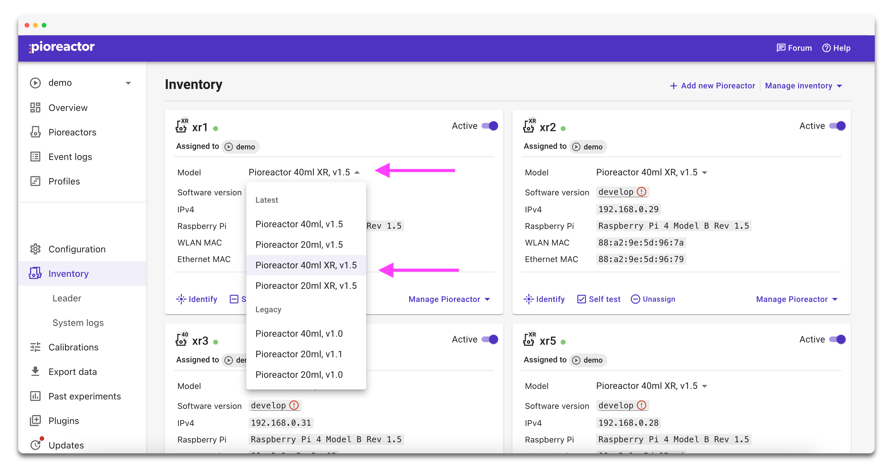 On the Inventory page, find the Pioreactor you upgraded, select Model, and choose the XR version.