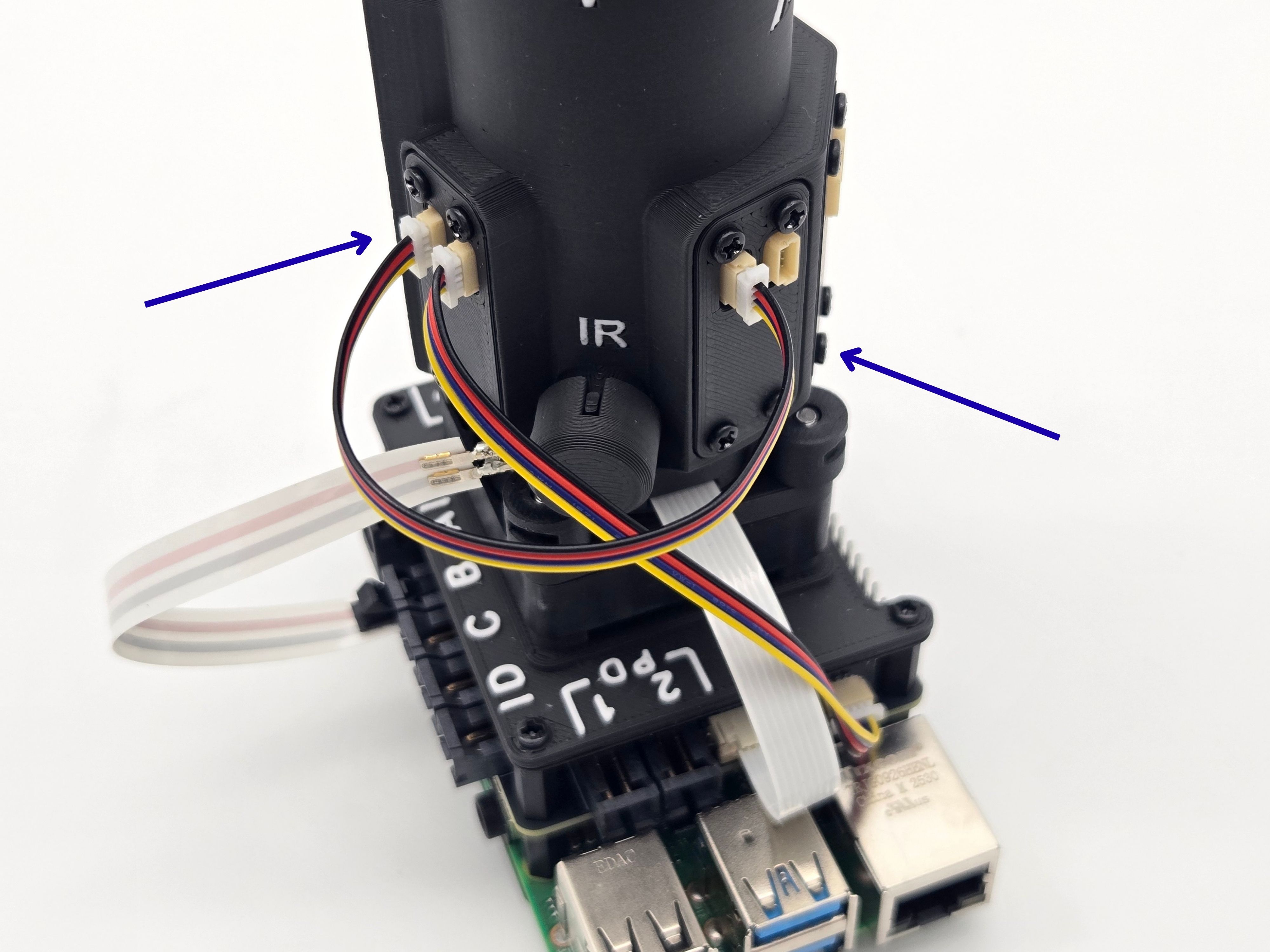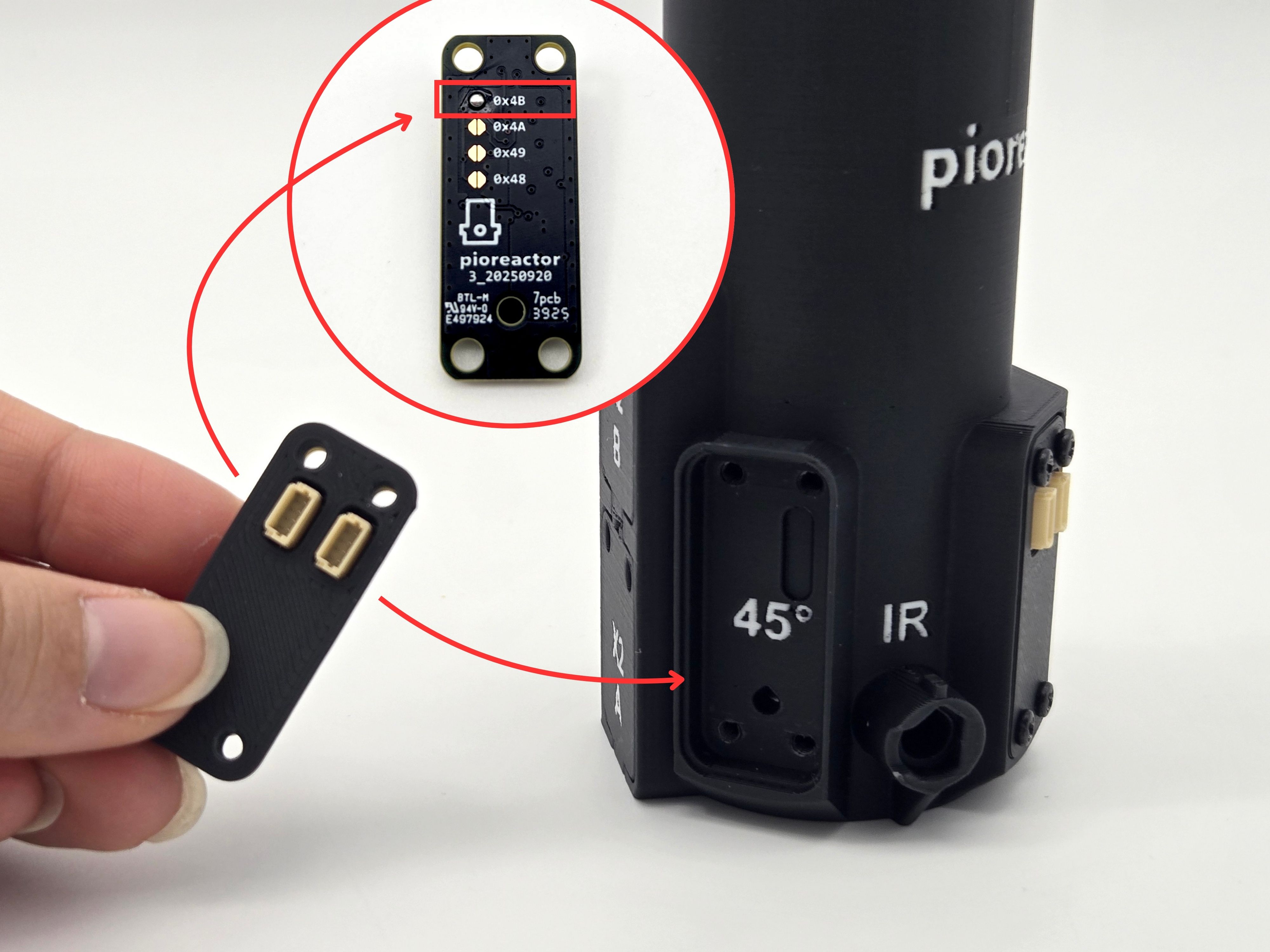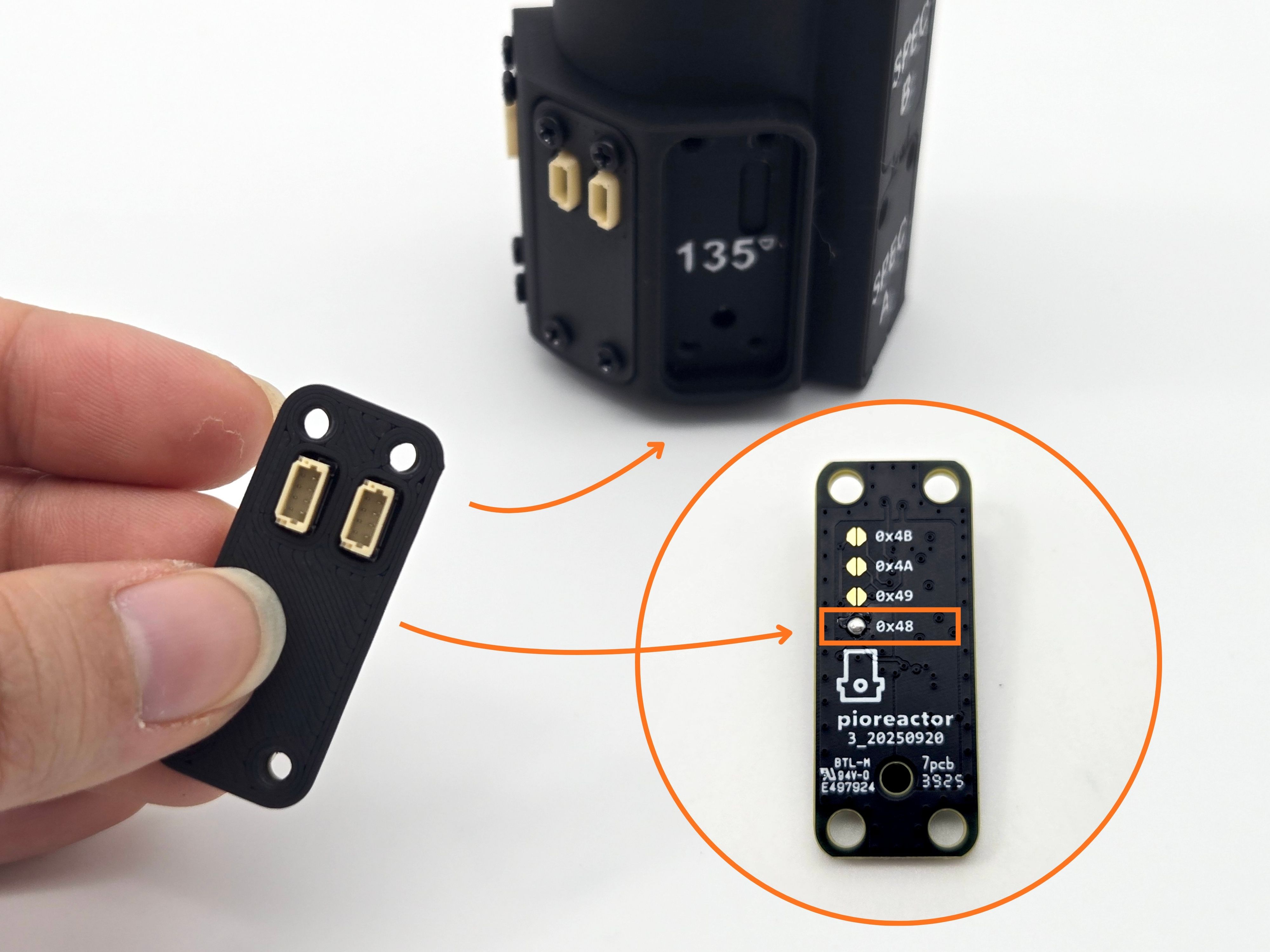 - Last, the eye-spy with the address 0x48 goes into the 135 degree pocket. Look for the soldered bulb next to the bottom address. Secure it with the cover and 4x 8mm screws.