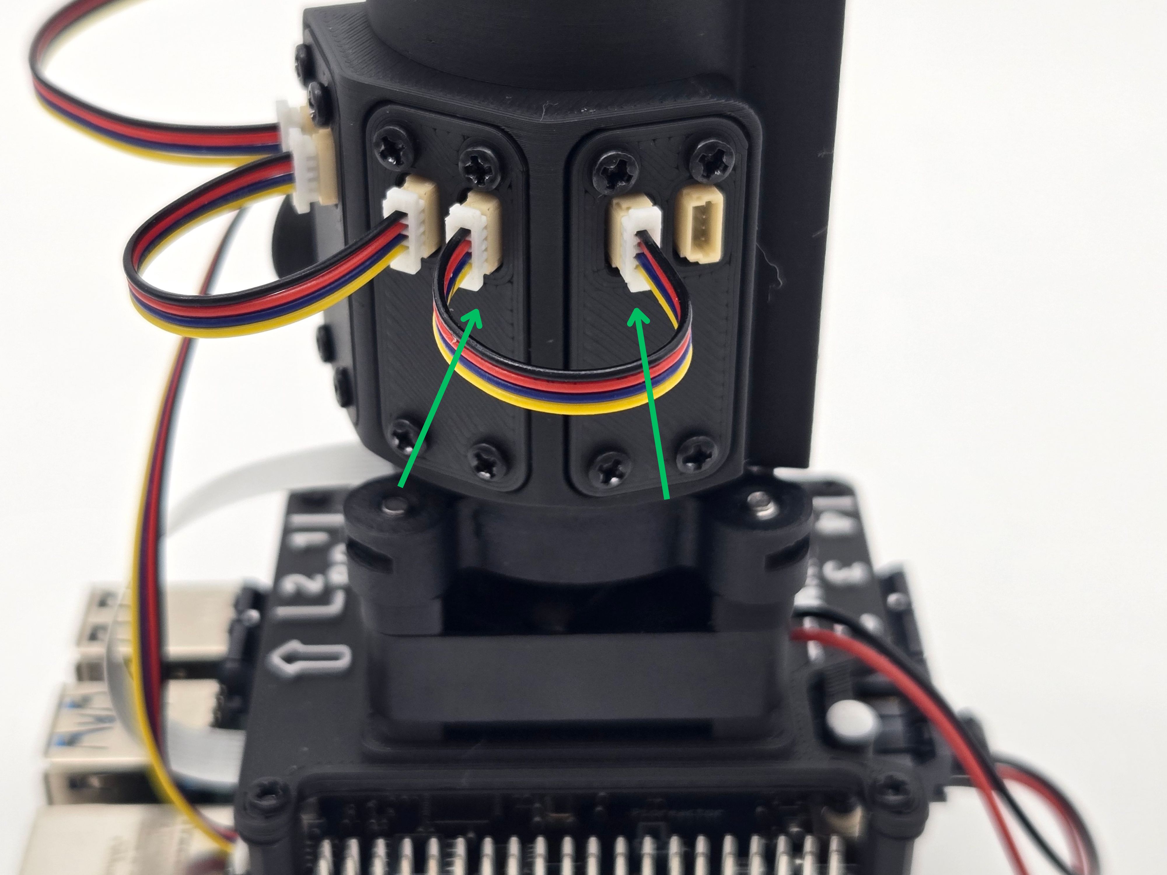 - A 100mm STEMMA-QT wire should be still connected to the HAT. Connect the other end to the leftmost, 45 degree eye-spy. Pay attention to the wire orientation: the yellow wire should be at the bottom.