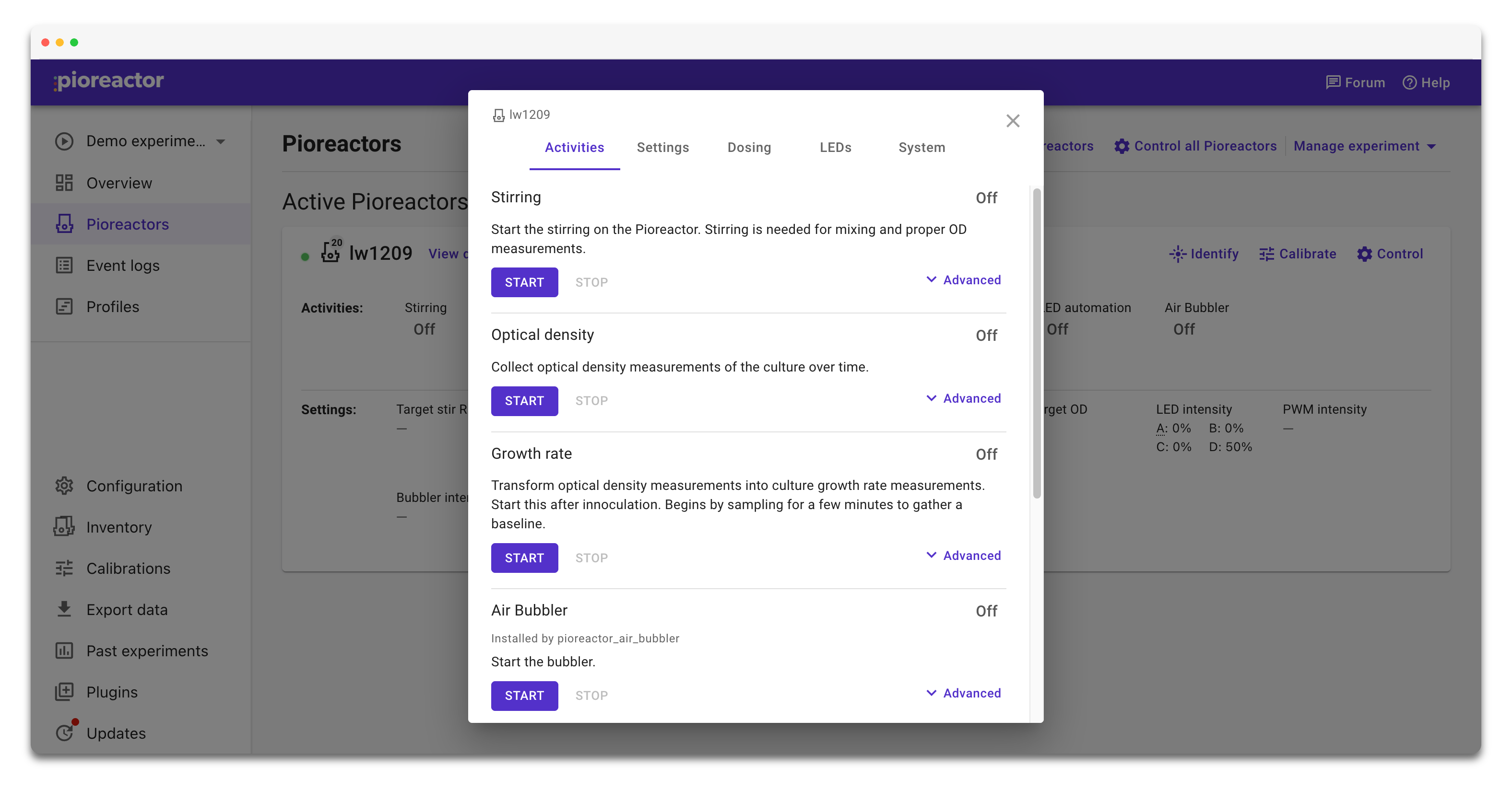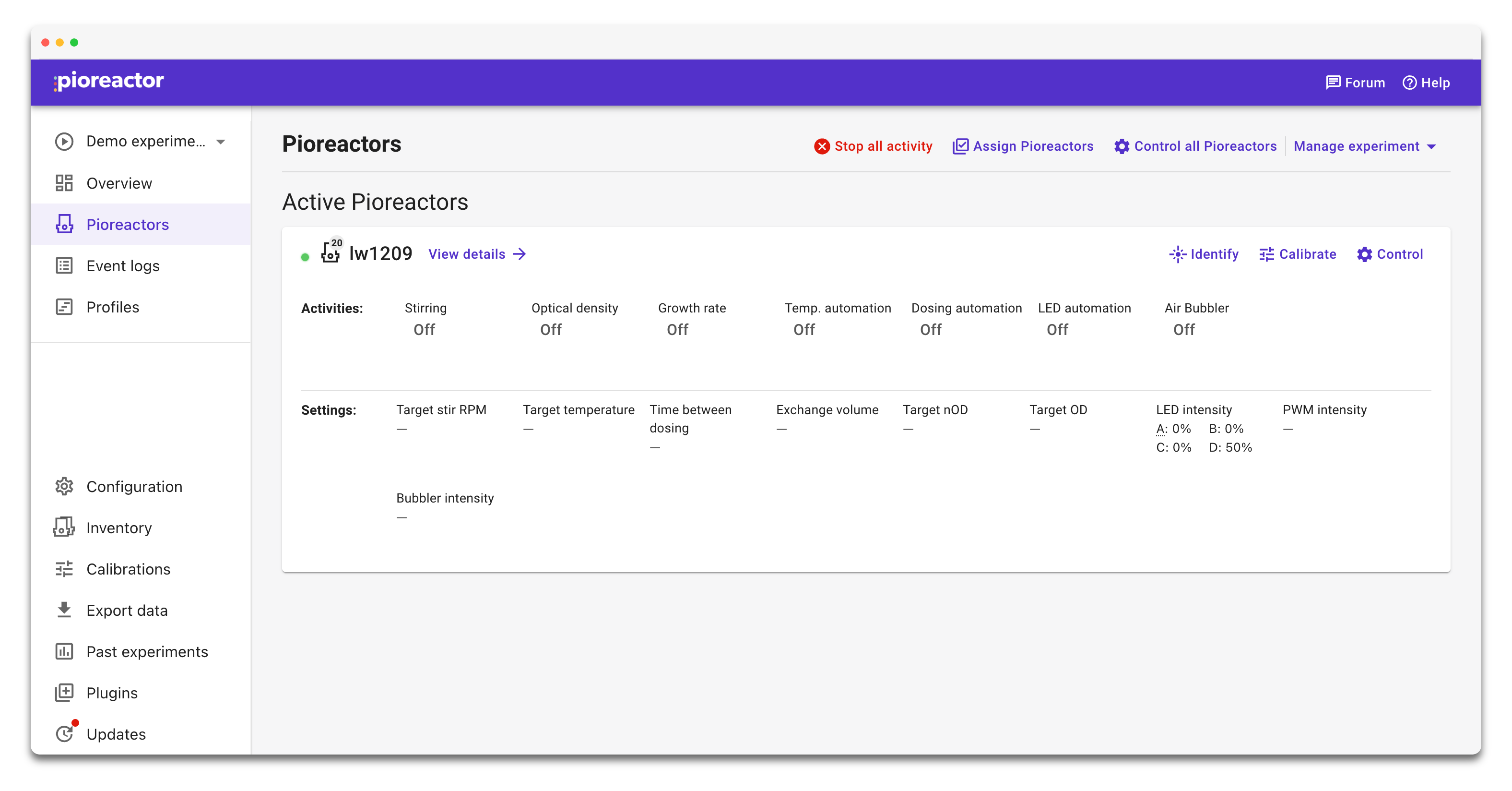 On the Pioreactors page, you should see at least one Pioreactor under Active Pioreactors. You can start an activity using the "Control" button. Once started, you can pause (and then resume) or stop jobs. Clicking the "Control all Pioreactors" button will give you control to start and stop activities on all active Pioreactors.